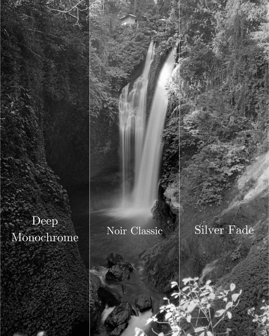 Deep Monochrome – Dramatic, bold, and quietly cinematic. Rich blacks, strong contrast, and a moody finish that adds depth and mystery.